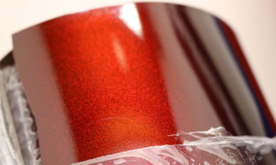 Knallrote, funkelnde Folie mit kleinen Metallflocken unter der Deckschicht